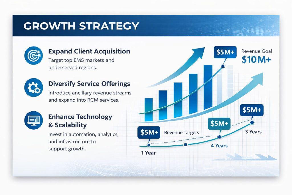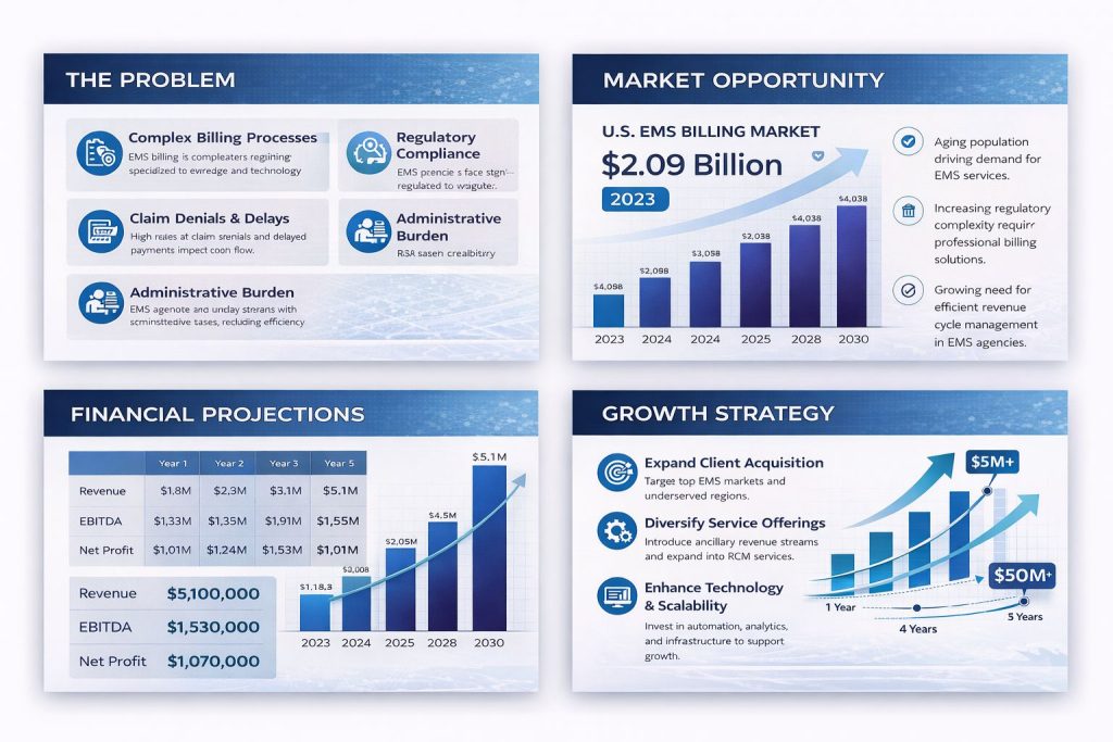 These examples illustrate how we present problems, market opportunity, financial projections, and growth strategy when preparing investor facing materials.